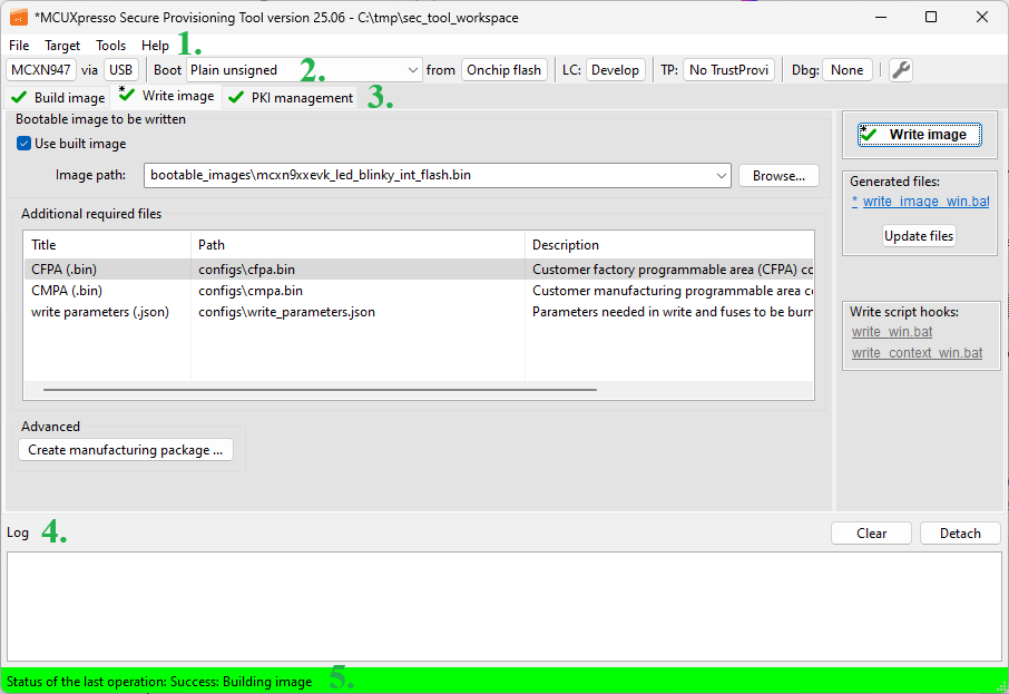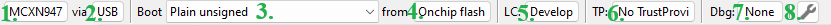 To verify the build and write process with your application, use the default profile that application code is unsigned and plain (not encrypted). Later, when you already have the application tested in the tool, you can select a secure profile, and the tool generates keys and pregenerates a configuration for the secure boot.